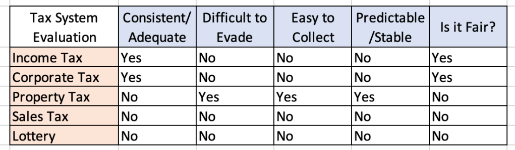 Because all citizens, and in some instances like sales taxes, sin taxes, and the lottery, even noncitizens pay taxes, a good tax system distributes the burden it creates among all people in an equitable manner. Most tax systems today are based on what is called “the ability to pay;” taxes are paid according to a person’s financial capacity or ability (Brimley et al., 2016). All tax systems can be judged on five basic criteria. Is the tax consistent or adequate, difficult to evade, easy to collect with very little bureaucracy, are they predictable or stable, and are they fair?